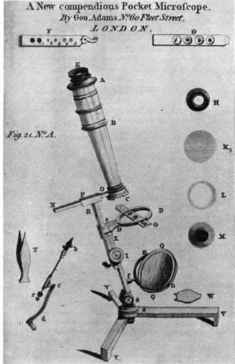 Kupferstich eines neuen Mikroskopmodells, das in der 1771 erschienenen vierten Auflage der "Micrographia Illustrata" von George Adams d.Ä. zum ersten Mal vorgestellt wurde