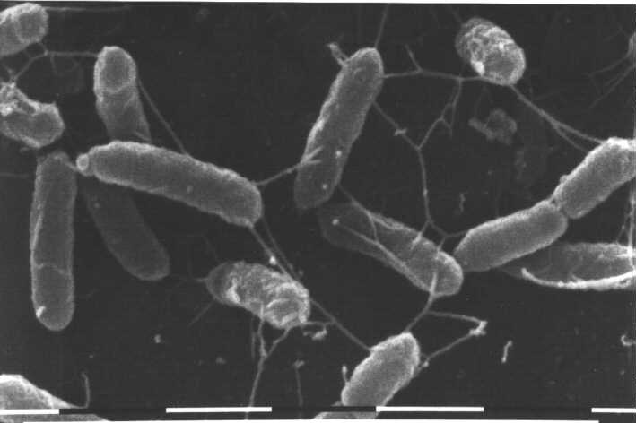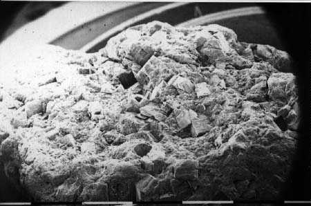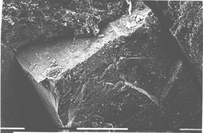 Maßstabbalken: 0,1 mm Vergr. 400 x Vermutlicher Pyritkristall mit Thiobacillen besiedelt