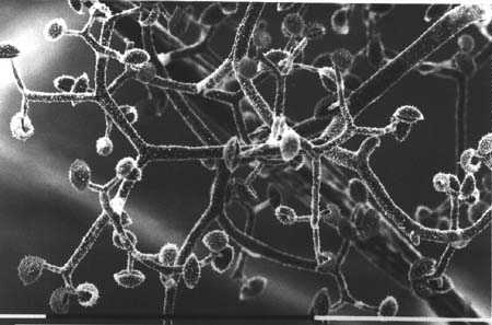 Die schwarzpigmentierte Zygosporangium ist umschlossen von den sogenannten Hüllhyphen.