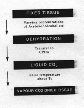 Tissue specimens are processed with the tissue in the baskets to the stage where the tissue is impregnated with the final substitution fluid (acetone, amyl acetate, freon 113 etc.). The boat is then filled with the final fluid and the basket rapidly transferred to the boat. The boat can then be loaded into the pressure chamber. When the specimen access door on the pressure chamber is closed, the drain valve of the liquid transfer boat is automatically actuated. The drain valve aperture is only 0.7Smm diameter. This results in a sufficiently slow drain action to allow liquid carbon dioxide to enter and cover the specimens before the substitution fluid level has fallen so as to uncover the specimens. |